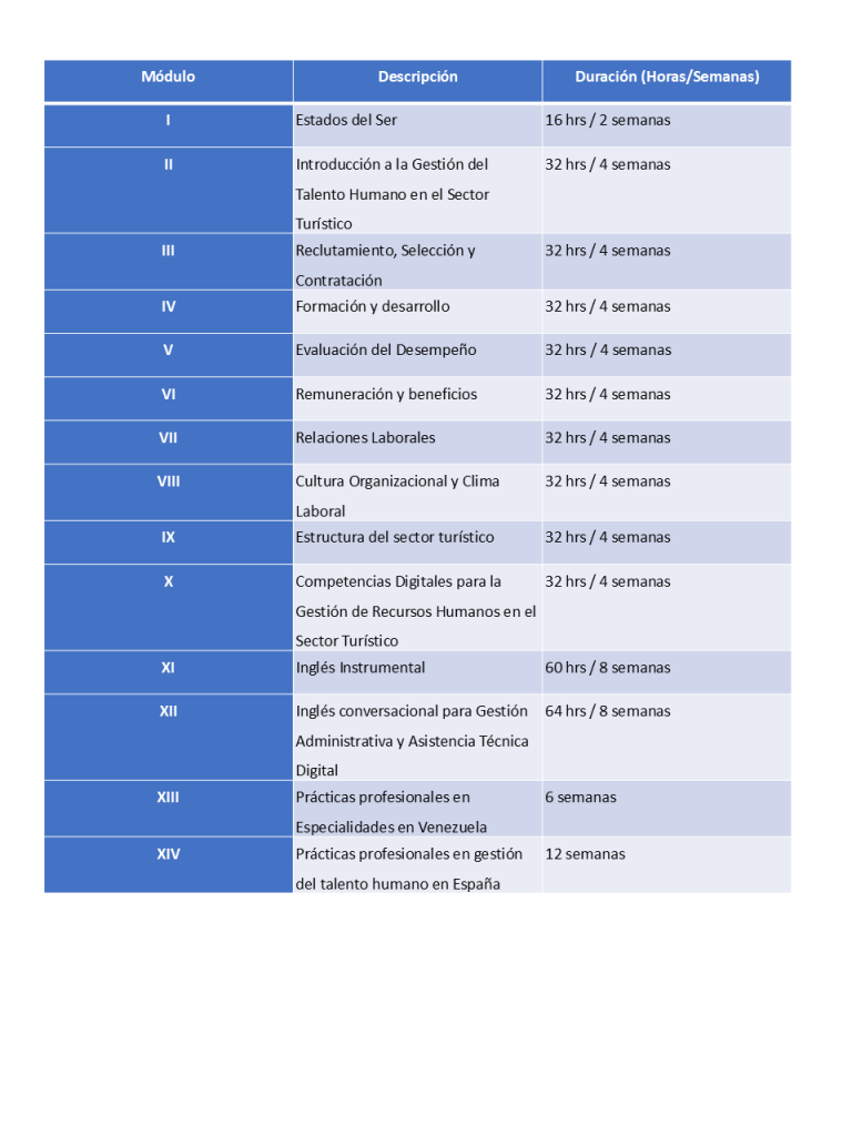 Formar profesionales altamente capacitados en la gestión de recursos humanos en el sector turístico, dotándolos de las herramientas y conocimientos necesarios para atraer, desarrollar y retener el talento, contribuyendo así a la mejora de la competitividad y el éxito de las empresas turísticas.